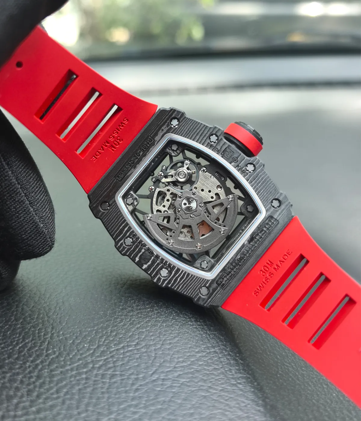 A: The replica closely matches the original in design including the Quartz TPT red strap and advanced composite case. It perfectly combines sporty and luxury elements. The Swiss clone movement ensures precise timekeeping and stable performance with minimal difference from the original.